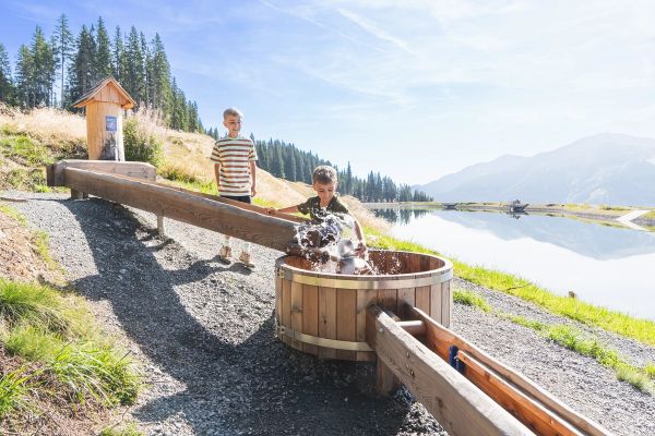 Auf der Kleeblattwiese am Kohlmais lädt Montelino’s Wasserspielplatz zum erfrischenden Planschen ein. Mit Wasserpumpen, Holzrinnen, Kübeln und zahlreichen Wehren kann Wasser befördert und bis zum Wasserrad und zurück in den Bach geleitet werden.
