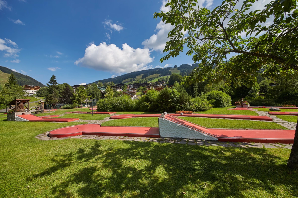 Hinter dem Tourismus Service Center in Saalbach befindet sich die Minigolf-Anlage.