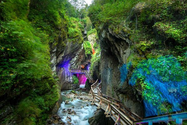 An gewissen Tagen wird die Klamm Abends mit bunten Lichtern beleutet.
